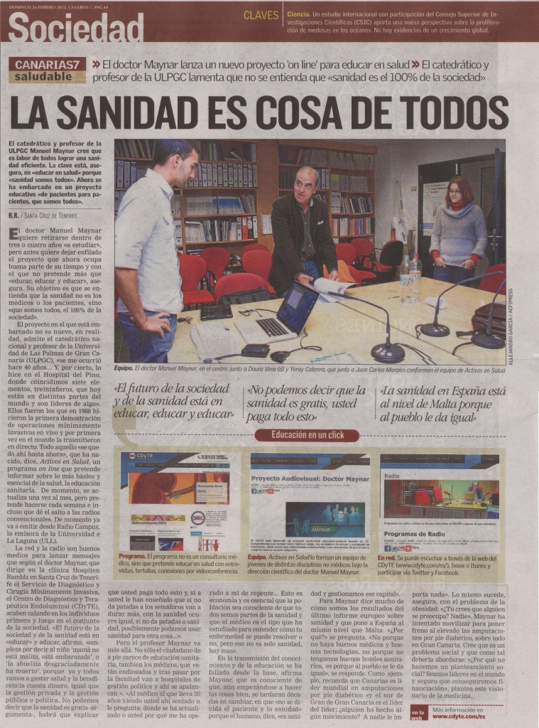 Artículo editado por el periódico Canarias7 acerca de una entrevista realizada al profesor Manuel Maynar, haciendo hincapié en la visión educativa del catedrático por sus iniciativas formativas. Durante la conversación, Maynar hizo especial mención al proyecto online de concienciación social sobre la salud (educación sanitaria) que desarrolla a través de la web de Éndolum – CDyTE y en el nuevo proyecto denominado Activos en Salud.